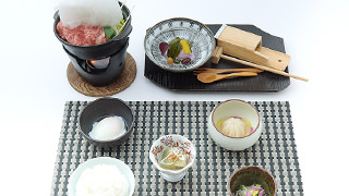 綿菓子を雲に見立てたすき焼き鍋です。温まると綿菓子が溶けてほど良い甘味になります。デザートは季節の紫芋のアイスにご自身でところてんをかけてお召し上がりいただきます。楽しい工夫がいっぱいです。