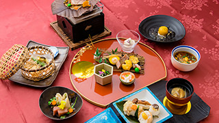 お好みのネタが選べる握り寿司、職人自慢の手打ちそば、鍋料理、鉄板焼き、さらには季節の料理を味わう花かご膳など、趣向を凝らした創作和食でおもてなしするレストランです。目の前で仕上げる刀削麺(とうしょうめん)は、四季折々の香味を添えた和風だしでお召し上がりいただくオリジナルスタイル。朝食は福田病院「母と子の農園米」を土鍋で炊いたごはんと手づくり豆腐、焼きたての魚にお味噌汁。作りたての味を提供いたします。四季折々の行事食を大切にしています。