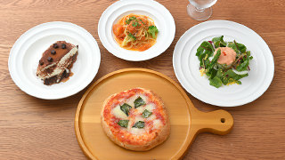 ピンサとパスタが楽しめるセットメニューです。食後のデザートにはティラミスをお付けしました。ピンサは米粉と大豆粉を合わせた生地で作ります。福田病院 母と子の農園米の米粉を使用しています。ピザとの食感の違いをお楽しみください。