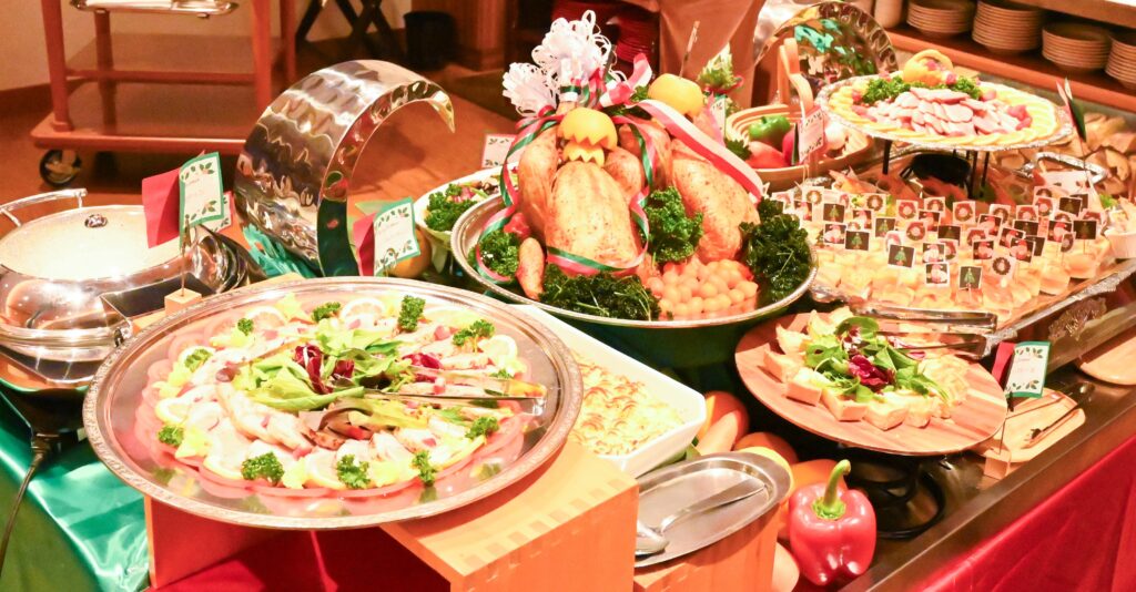 今年のディナーは、ビュッフェ形式で前菜8種をお出しした後、下記メニューをお召し上がり頂いております。