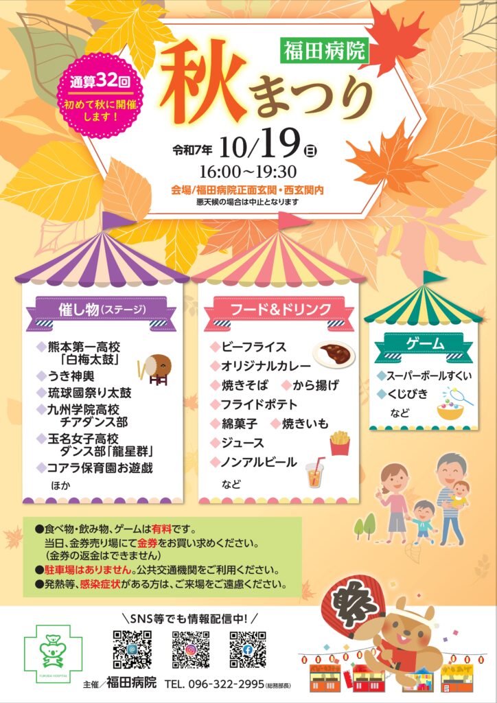 今年で32回目を迎える福田病院のおまつり。今年は初めて秋に開催します。当院のシェフたちが作るグルメやステージイベントなど、お楽しみが盛りだくさんです。皆様のお越しをお待ちしています。