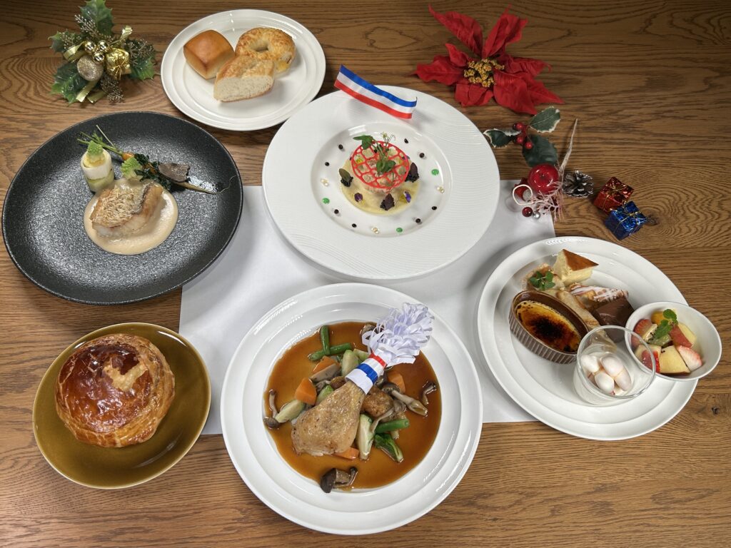 魚料理は甘鯛鱗焼きトリュフソース、メインはみつせ鶏のロースト、最後のデザートは7種類よりお選びいただきお召し上がりいただきました。