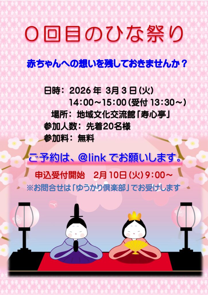 2026年3月3日(火)14:00~15:00に「寿心亭」にて「0回目のひな祭り」を開催致します。