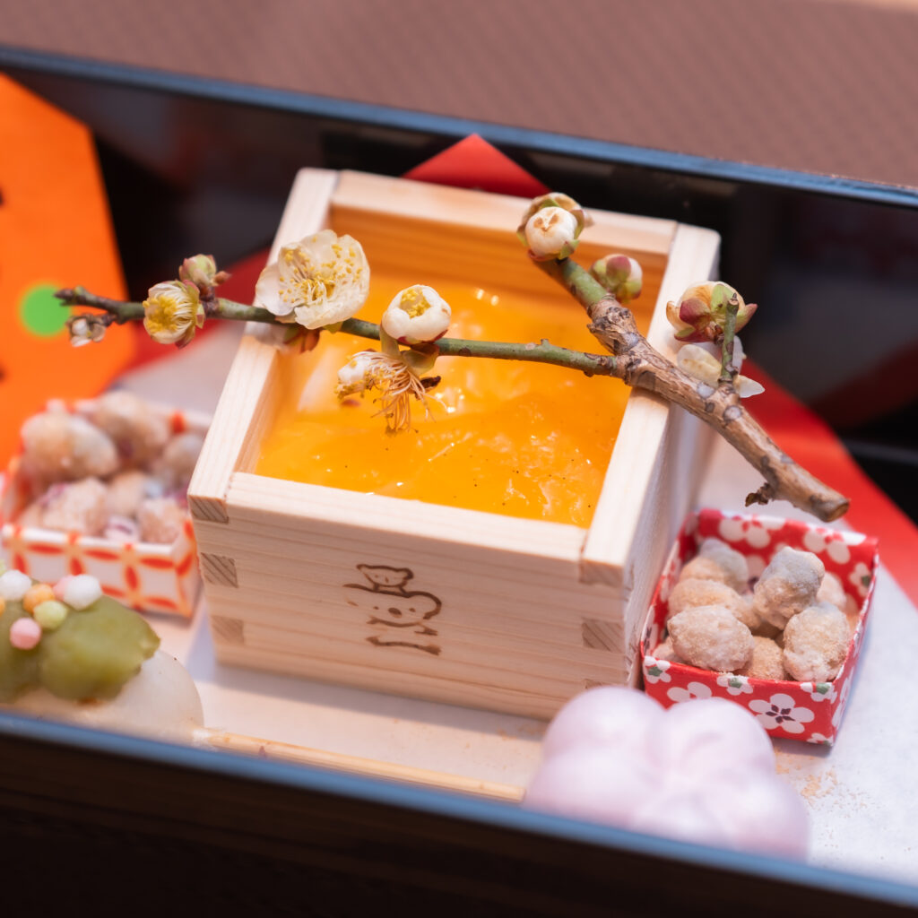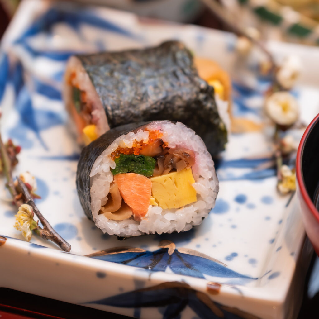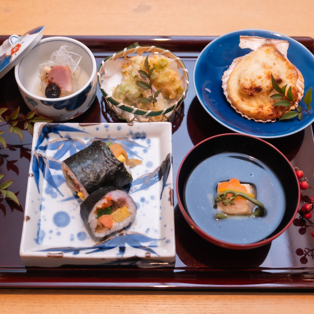 料理は、旬の食材をふんだんに使った前菜と、二の膳にはヒオウギ貝のグラタン、子フグの変わり揚げ、和食料理長実演の恵方巻き、甘味には大豆のりんかけ、デコポンヨーグルトムースなど節分にちなんだ料理を準備しました。