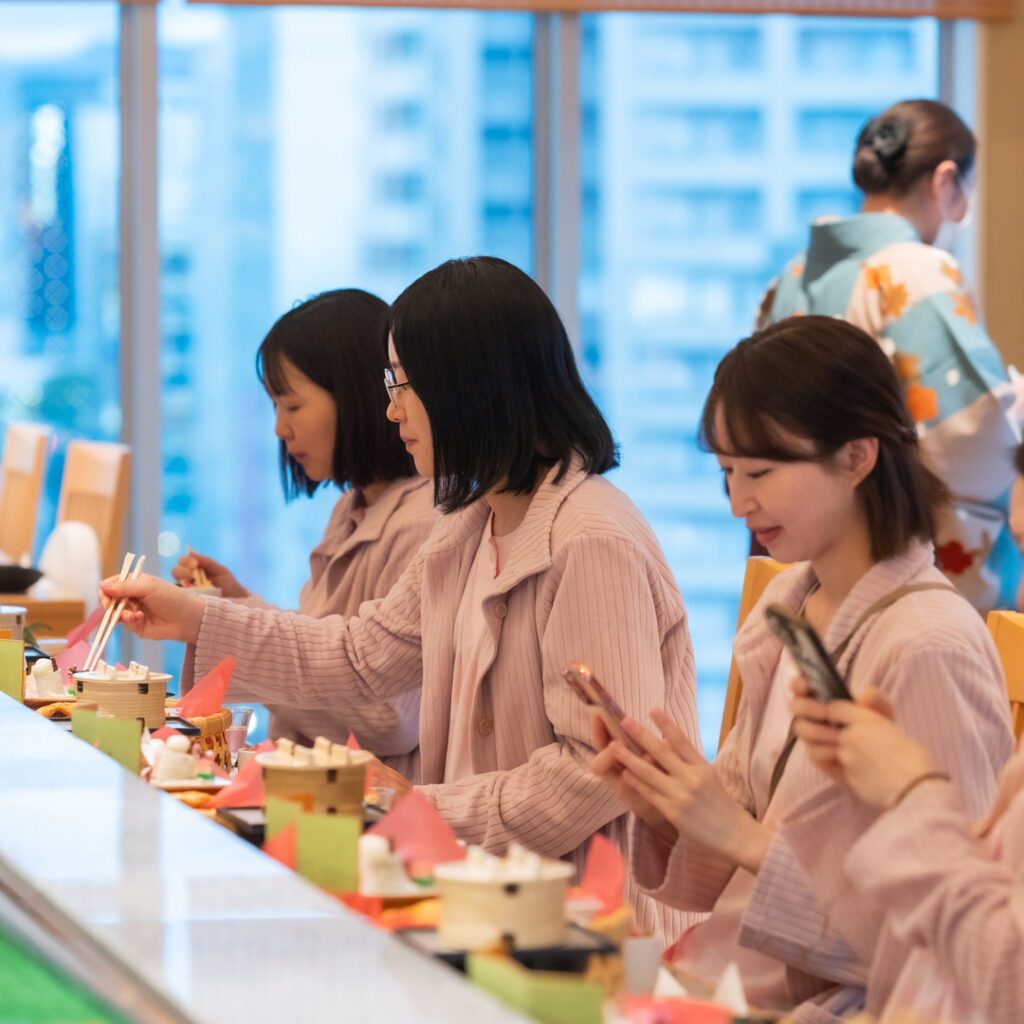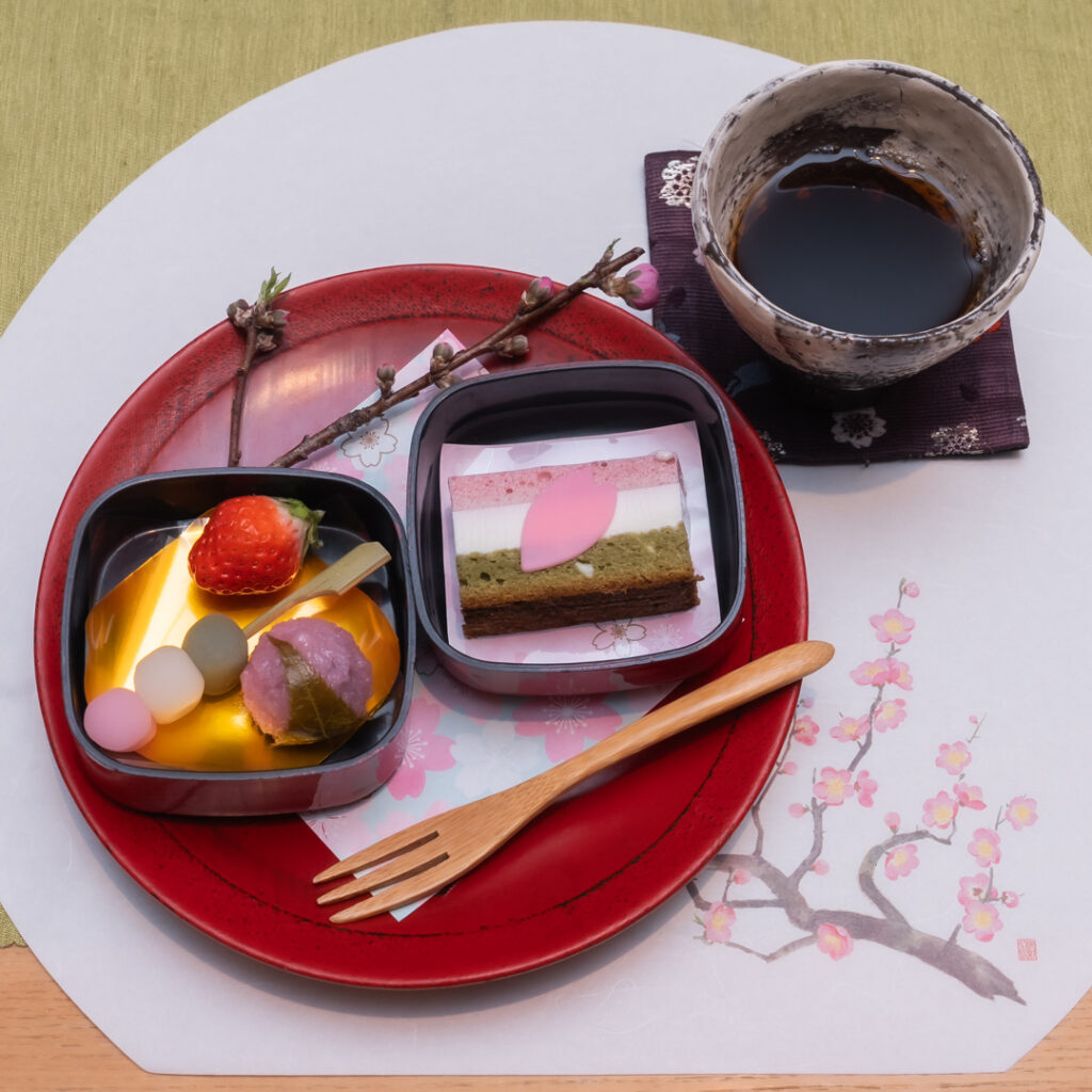 料理は、旬の食材をふんだんに使用し、春菊の白和え、新玉葱のスープ煮、春野菜の天ぷら、彩り豊かな花ちらし寿司、筍のお吸い物、帆立のパイ包み、甘味には桜餅、三色団子、菱餅をイメージしたムースを和紅茶を共にお召し上がり頂きました。