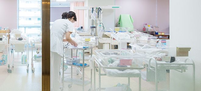 また、赤ちゃんは8階の新生児室で診察や検査、沐浴等を行います。お母様が保健指導やお食事の時は赤ちゃんのお預かりをしています。