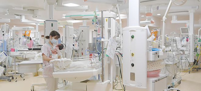 新生児センター(NICU・GCU)は、治療を必要とする赤ちゃんを24時間体制で受け入れ、高度専門医療をおこなう部署です。早産(妊娠37週未満で出生)低出生体重、感染症や呼吸障害、黄疸などの疾患を対象として、年間約900人を治療しています。